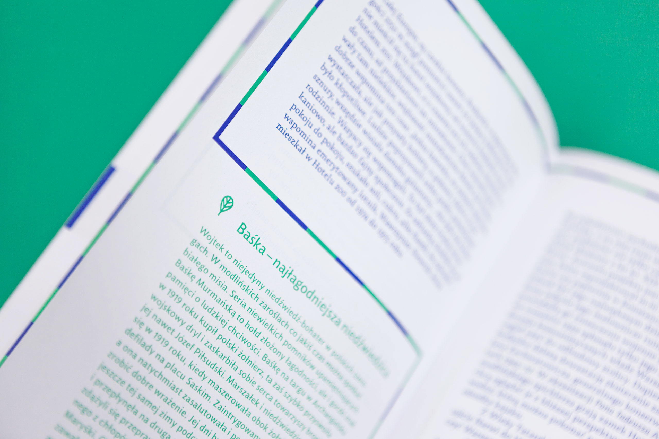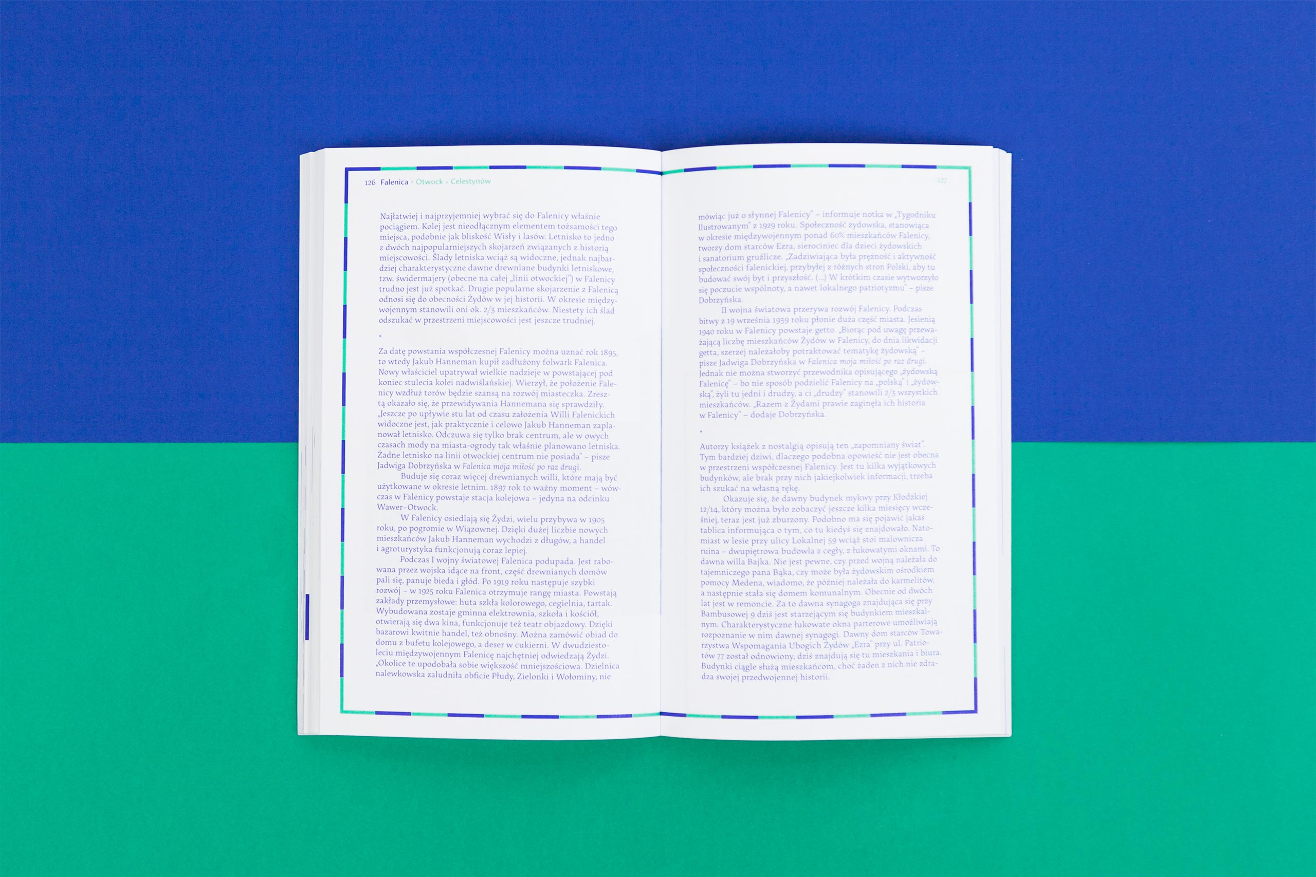 Dwukolorowa ramka oplatająca rozkładówki nawiązuje do ram wykorzystywanych w mapach. Jej podstawowe znaczenie jest typowo konstrukcyjne – oddziela dodatkowe informacje od tekstu głównego.