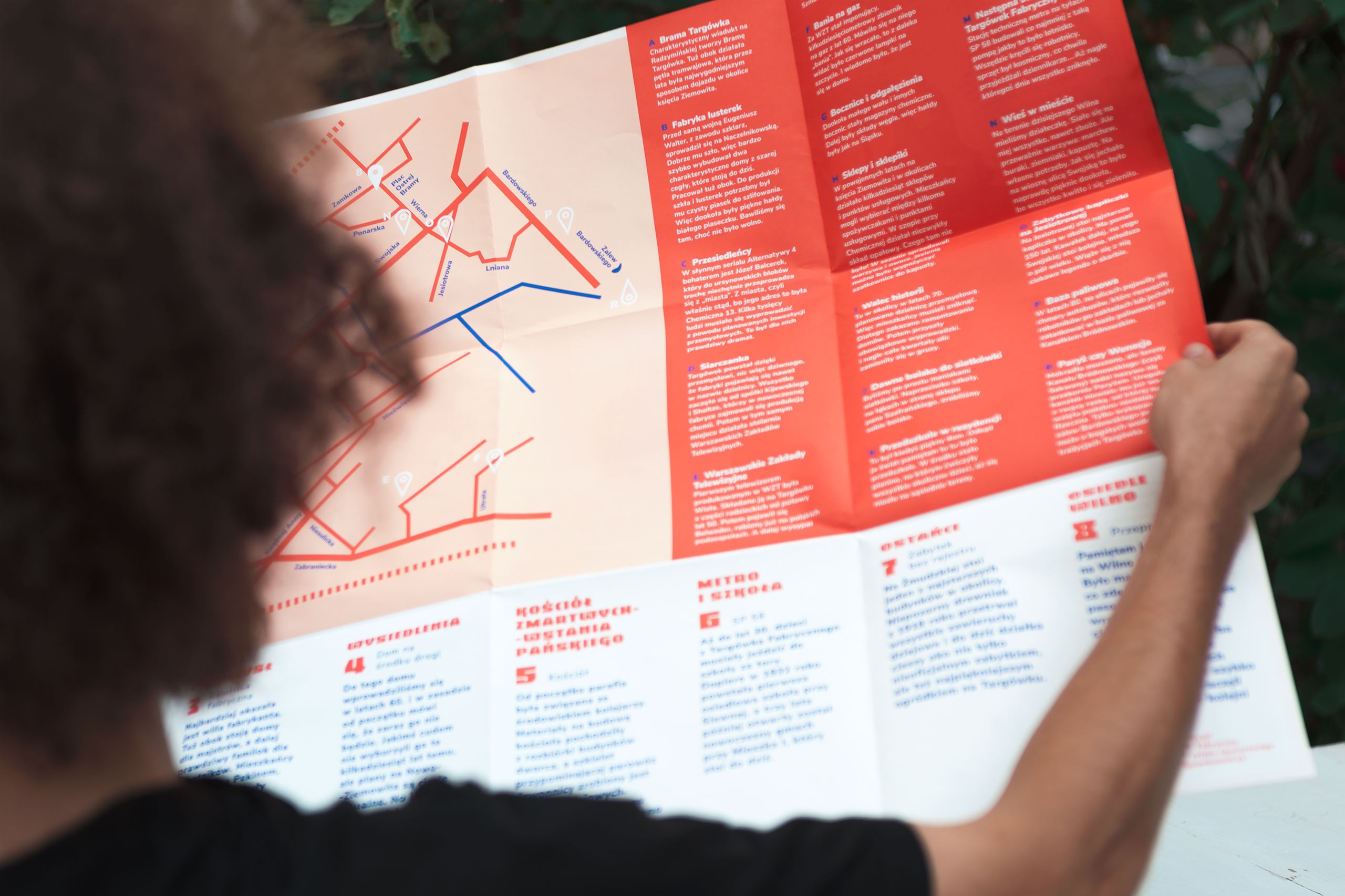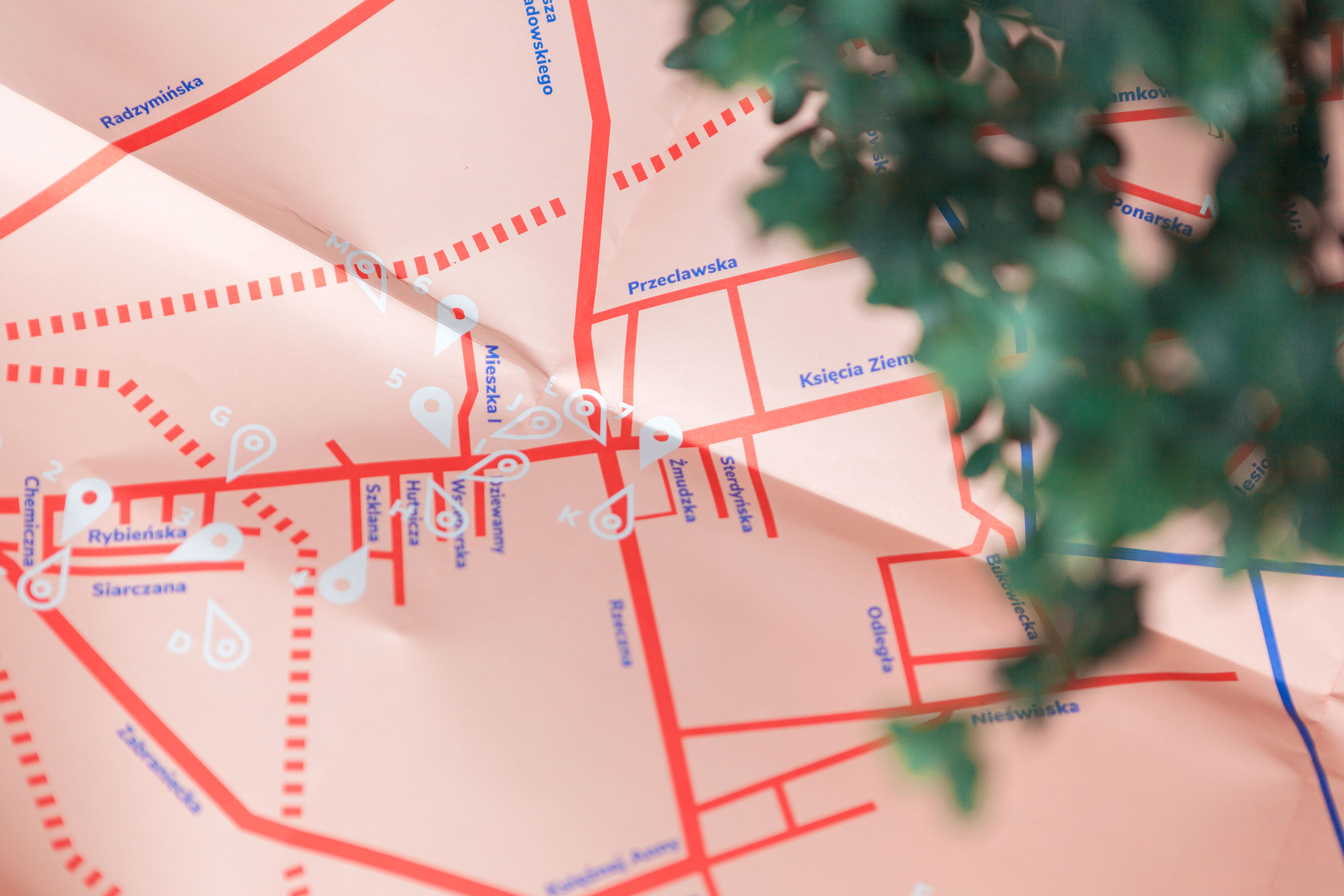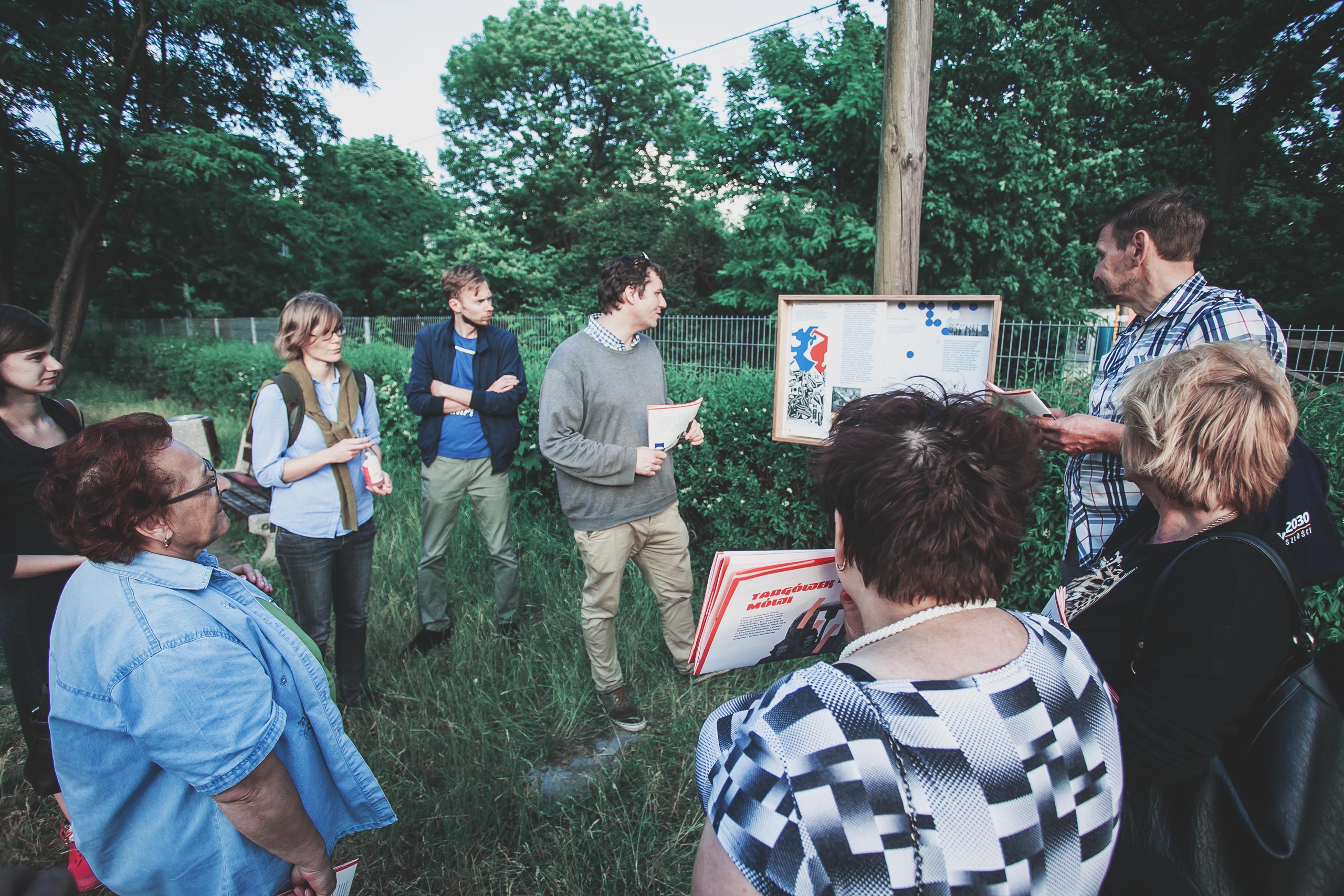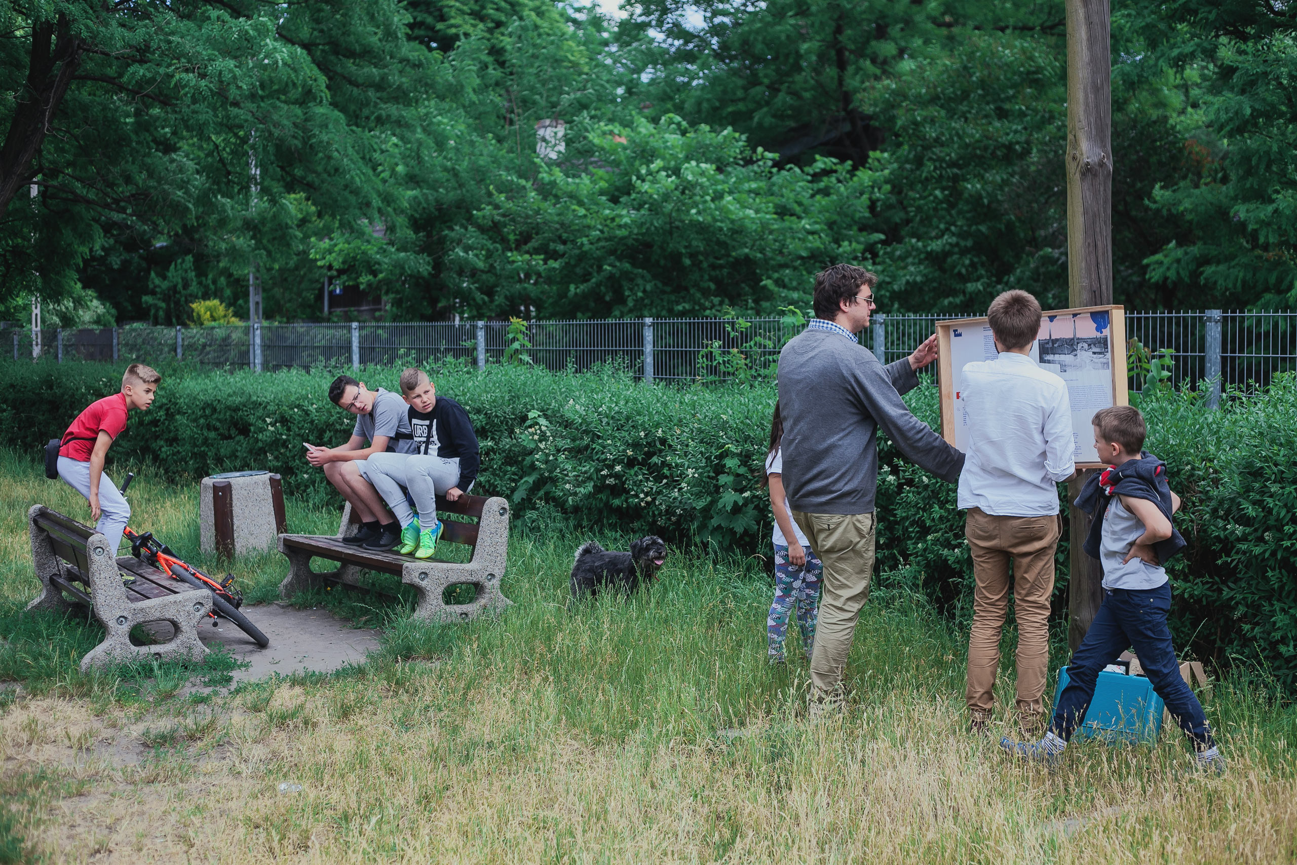 Uczestnicy zajęć stawali się dyrektorami artystycznymi, których koncepcje opracowywaliśmy następnie w rzemieślniczy sposób nadając im konkretne formy. Efektem naszej współpracy są tablice szlaku, ilustracje do strony internetowej oraz mapa dzielnicy.